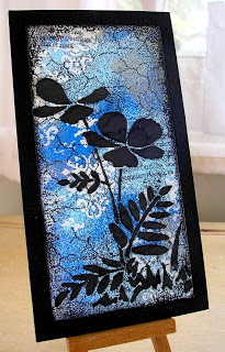 We love the cool blue colour scheme contrasted with the dramatic black texture paste. The subtle text and crackle stamping is delicate, yet brings the whole look together!