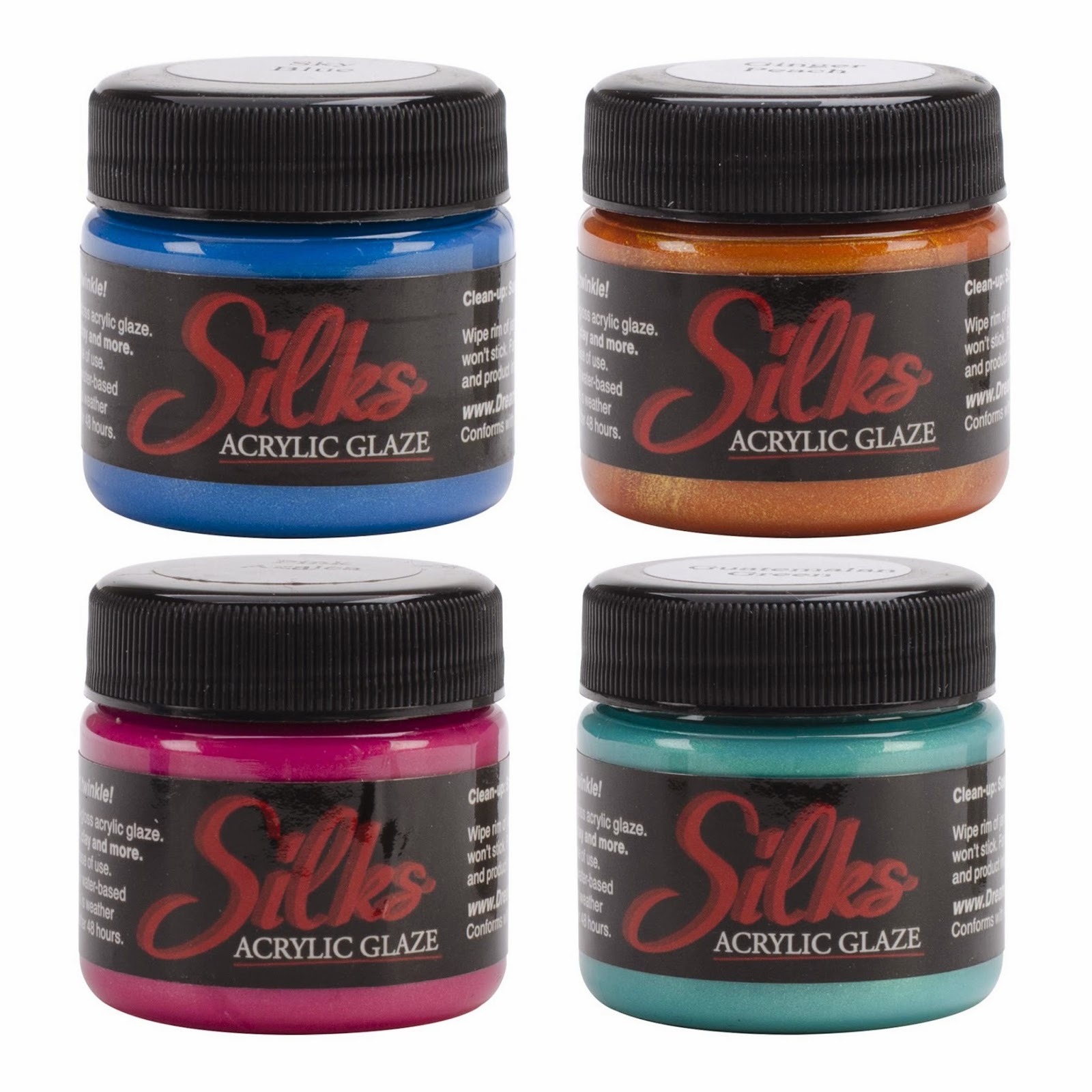 Silks are gorgeous iridescent and semi transparent acrylic glaze paints in a variety of shimmering colours. They can be used on paper, wood, fabric, papier mache, acrylic and other plastics, canvas, clay and much more. These paints are used by some of the most prominent mixed media artists in the business!