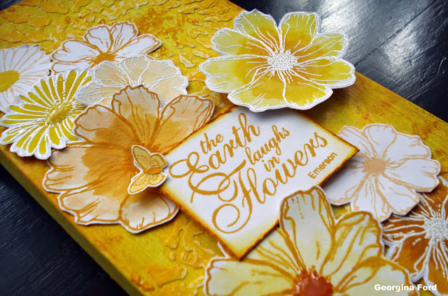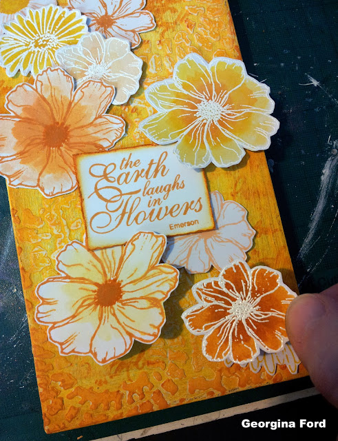 For the flowers I used Hobby Art's Floral Greeting stamp set. I stamped the flowers in Wild Honey, Dried Marigold and Mustard Seed Distress Inks. I also stamped the flowers using a VersaMark ink pad. I then heat embossed these flowers with WOW! Bright White embossing powder. I coloured the flowers using the Distress Ink pads. To do this I stamped the ink pad onto an acrylic block and then added a little water so I could paint with it.